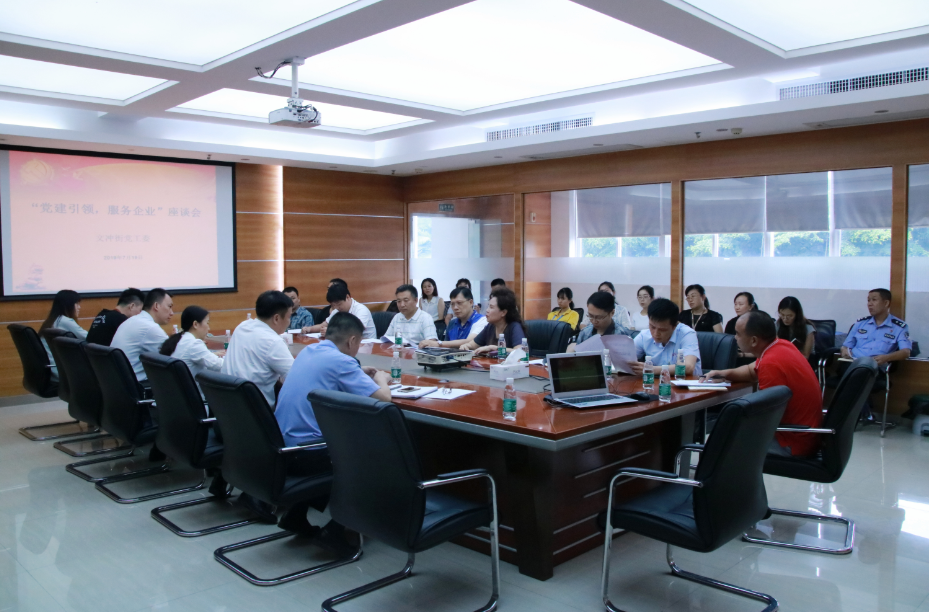 7月19日上午,文冲街党工委“党建引领 服务企业”座谈会在状元谷召开,为进一步加强“党建引领 服务企业”工作,切实为企业排忧解难、营造良好营商环境,文冲街书记陈鸿钦、副书记谢雪东、派出所所长原智华和组织办、经发办工作人员及开云·体育-中国一站式服务平台、捷普电子、京东、苏宁、酒仙网、广州城投意谷科技股份有限公司等十余家企业代表参加了会议。